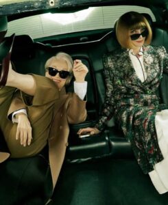 Fotografia është realizuar nga legjendarja Annie Leibovitz, ndërsa të dyja ikonat janë veshur me krijime të markës luksoze Prada. Kopertina vjen në prag të publikimit të filmit The Devil Wears Prada 2, i cili pritet të dalë në kinema më 1 maj, duke rikthyer vëmendjen te një nga historitë më të famshme të botës së modës.