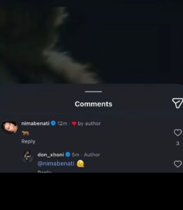 Në një nga postimet e fundit të reperit në Instagram, fansat kanë vënë re një koment nga Nima Benati, një emër i njohur në industrinë ndërkombëtare të modës. Ajo është e lidhur me marka prestigjioze dhe është vlerësuar nga Forbes në listën 30 nën 30, duke konfirmuar ndikimin e saj në këtë fushë. Komenti i saj ishte i thjeshtë, i shoqëruar vetëm me një emoji tigri, por reagimi i Don Xhoni nuk kaloi pa u vënë re. Reperi jo vetëm që e pëlqeu komentin, por iu përgjigj me një emoji, duke shtuar edhe më shumë dyshimet dhe interpretimet në rrjet.