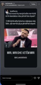 Pas gjithë kësaj vëmendjeje, reagoi edhe bashkëshortja e Mirit. Ajo ndau në Instagram një postim të mikut dhe kolegut të tij nga West Side Family, Land Hysi. Në postimin e rishpërndarë hidhen poshtë aludimet për një romancë të mundshme mes Mirit dhe Selinës, duke e cilësuar situatën si një histori të ekzagjeruar që po përsëritet vazhdimisht. “Njerëzit mund të pranojnë edhe marrëzitë më të skandaloze nëse përsëriten shpesh. E tillë është edhe historia e ndjenjave ndaj Selin, një marrëzi që po përsëritet shpesh. MIRI, MIRI DHE VETËM MIRI,” – thuhej në postim.